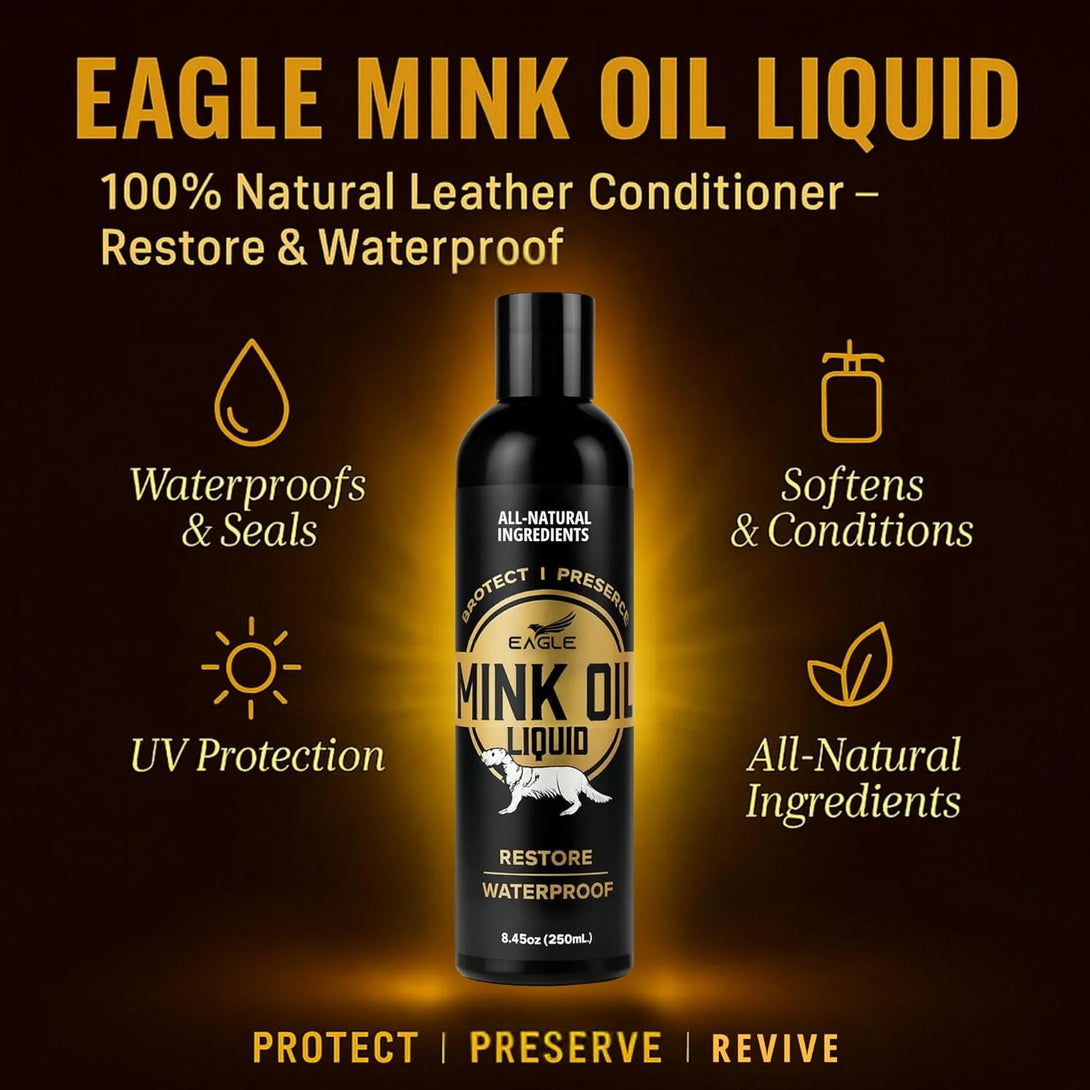 Eagle Mink Oil Liquid Leather Conditioner 8oz with Cloth – Softens, Waterproofs & Preserves Boots, Shoes, Bags, Jackets & Furniture – Natural Leather & Vinyl Conditioner for Long-Lasting Protection
