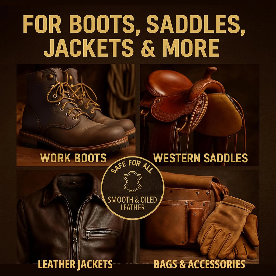 USE ON LEATHER BOOTS, BAGS, FURNITURE, & MORE: Ideal for boots, shoes, gloves, belts, purses, car interiors, couches, and leather jackets. (Do not use on suede or nubuck.)