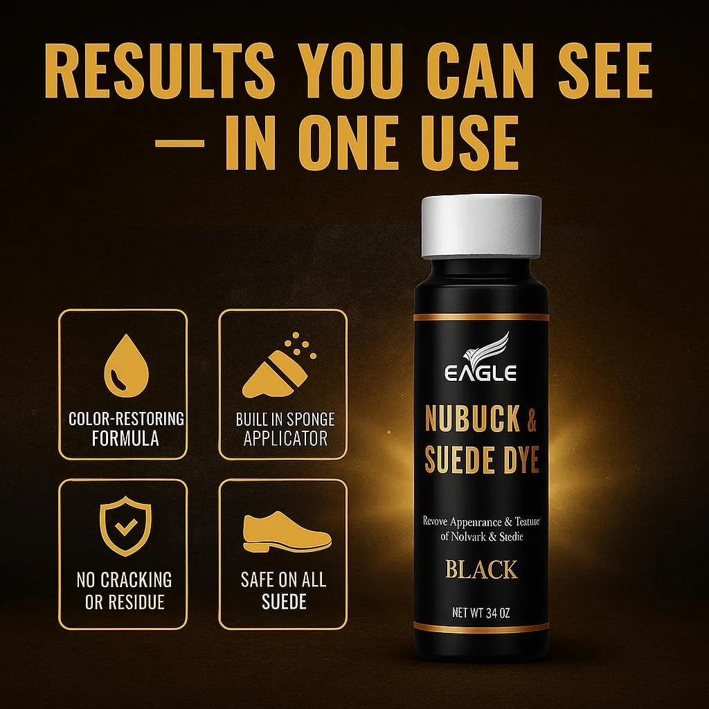 REVIVE & RESTORE BLACK SUEDE – Eagle’s Nubuck & Suede Dye is specially formulated to restore faded or discolored suede and nubuck, bringing your shoes, boots, and accessories back to life with a rich, deep black finish.